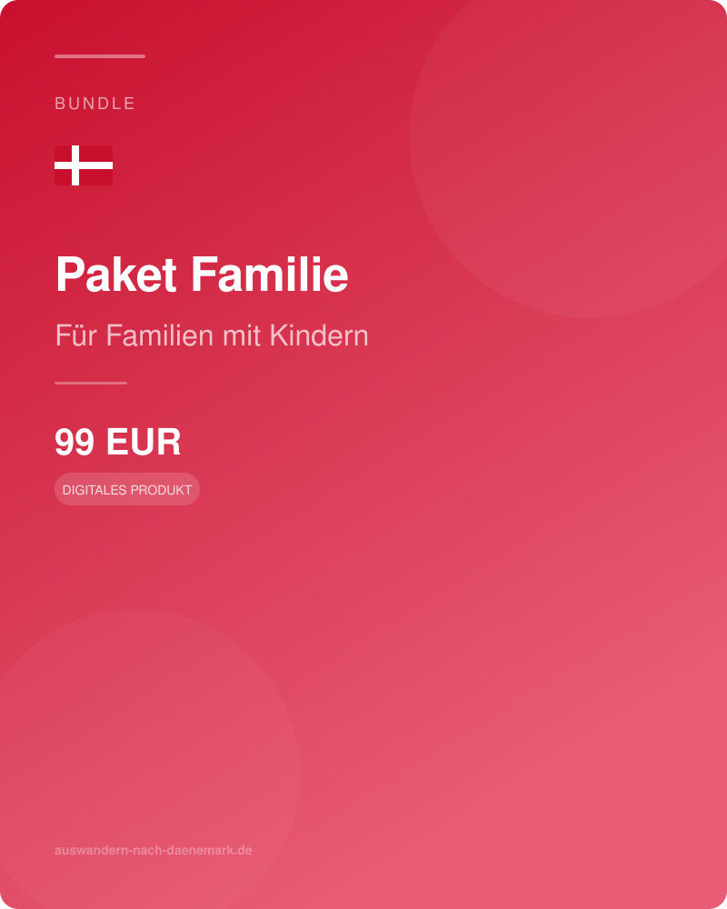 Das Familien-Bundle kombiniert alle notwendigen PDFs für Familien: Behörden-Bibel, Banken & Finanzen, Versicherungskompass, Steuern DK, Auswandern mit Kindern (mit aktueller Barselsorlov-Reform) und 1 Regionenguide. Einzelpreis 158 € – als Paket 99 € (37 % günstiger).