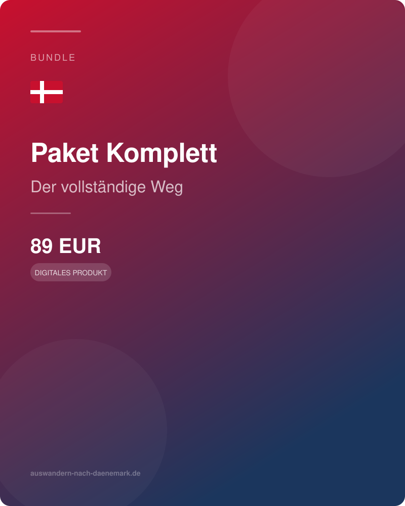 Das Komplett-Paket enthält alle essenziellen Guides für den typischen Auswanderer: Banken & Finanzen, Versicherungskompass, Steuern DK, Rentenportabilität, Behörden-Bibel (Flagship) sowie 1 Regionenguide. Einzelpreis 139 € – als Paket 89 € (36 % günstiger).